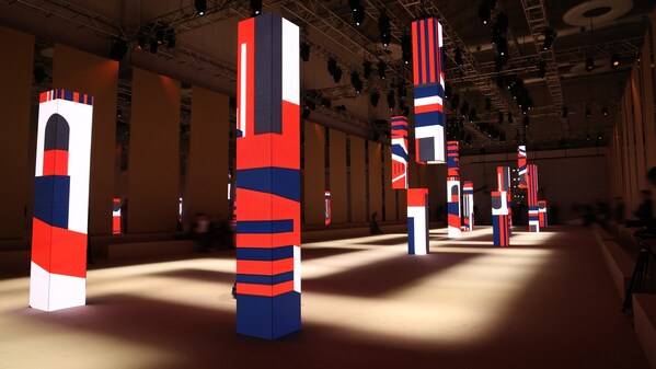 秀场设计以主题"流动的都市"为核心概念,秀道空间中多组动态视觉装置林立其中,高低起伏并错落有致,以变幻流转的几何色彩构型诠释米兰的都市生活节奏与多元风格美学。模特的行走轨迹、观众凝望的目光彼此交织,虚实相映之际,将"流动"从视觉隐喻转化为可被感知的空间韵律。行走其间,人与影像相互穿透,仿佛步入真实与想象交界的城市幻境,将每一刻都凝练为米兰城市脉搏的生动切片。